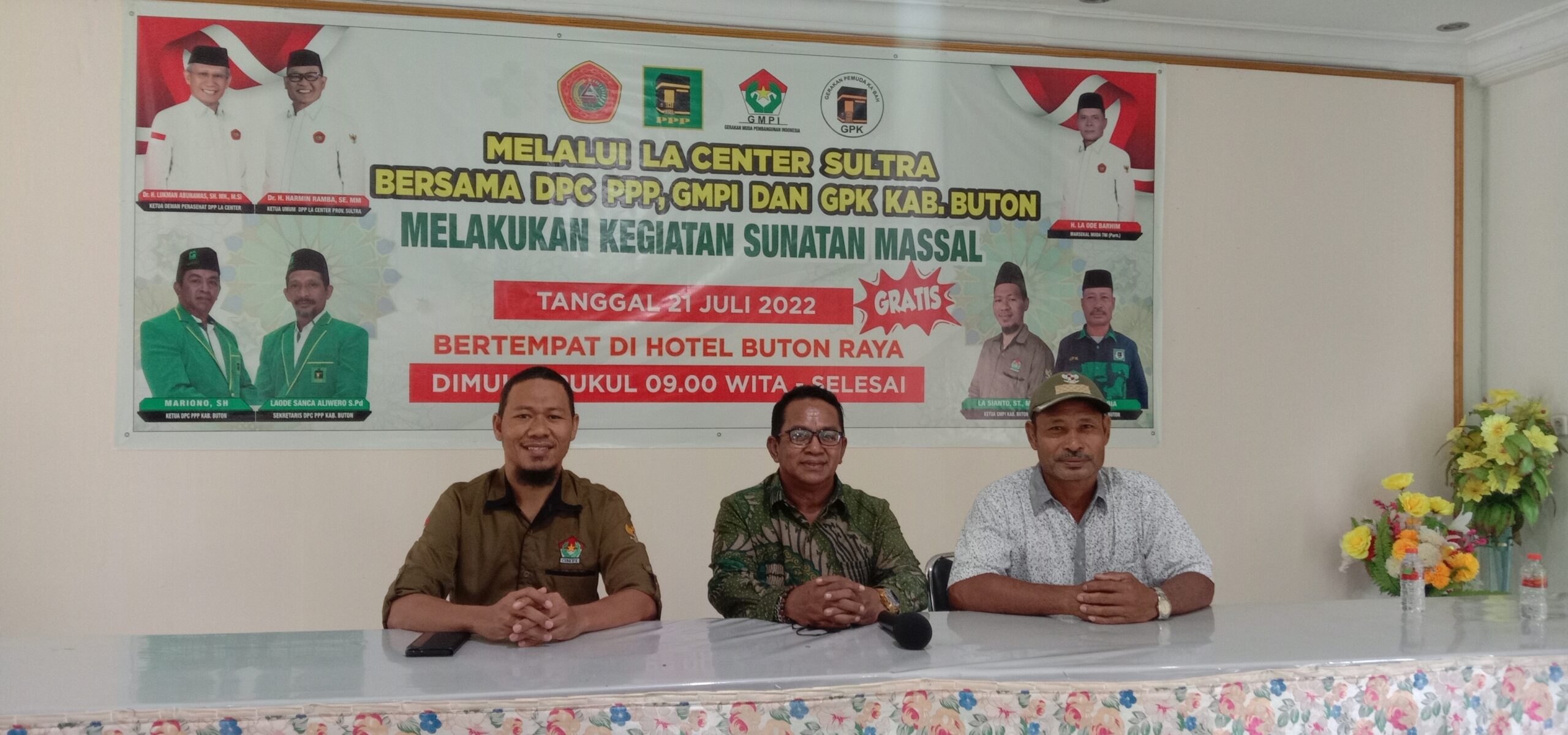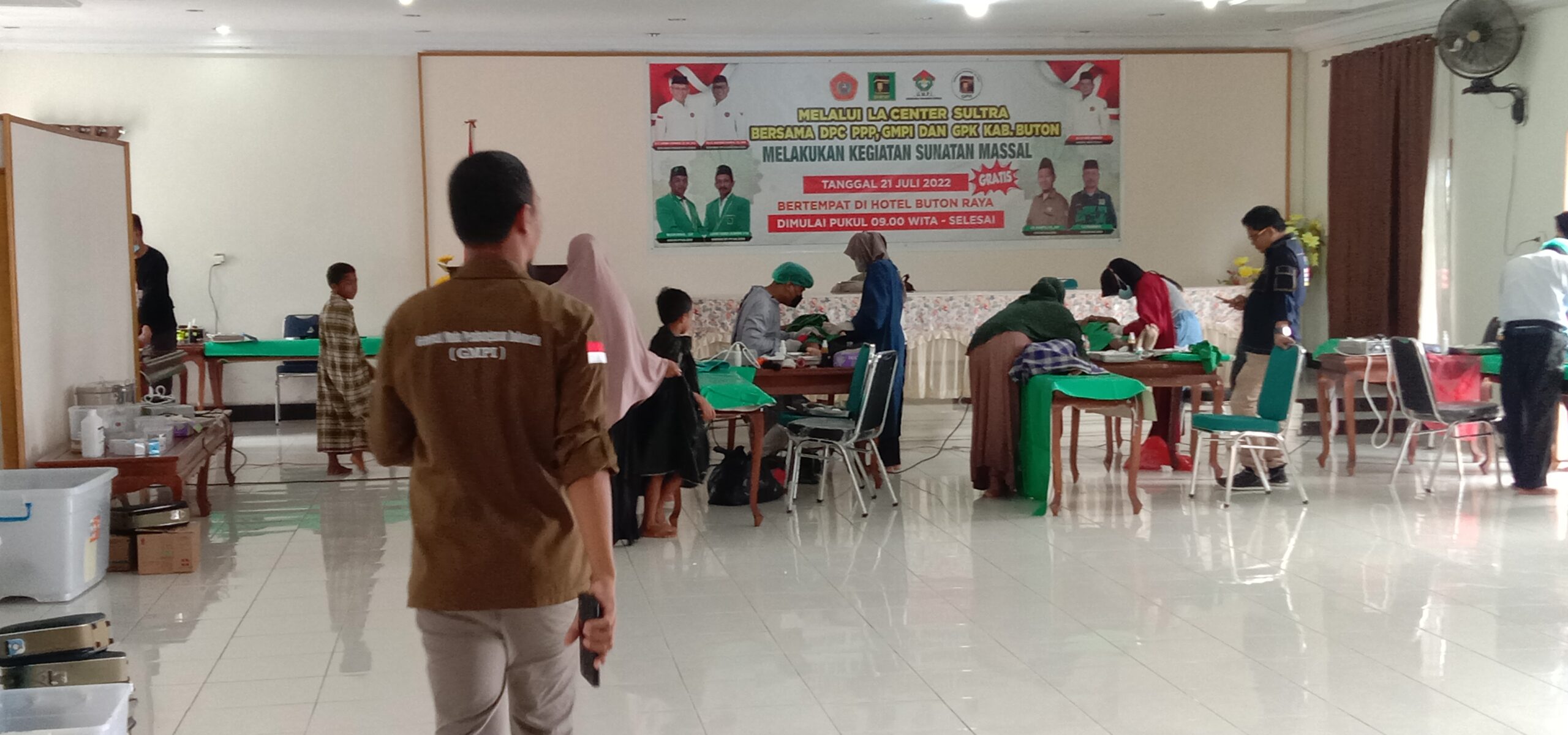 MonitorSultra.Com, BUTON – Melalui program Lukman Abunawas (LA) Center Sultra, DPC PPP bersama organisasi GMPI dan GPK Kabupaten Buton melakukan sunatan massal di Hotel Buton Raya, tepatnya di Jalan Baru Kecamatan Pasarwajo, pada Kamis, (21/7/2022).