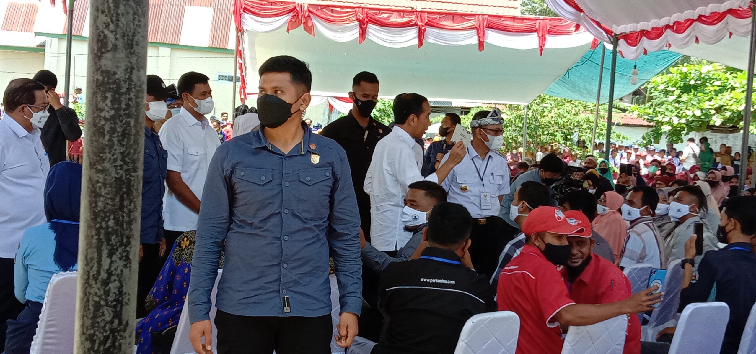Lebih lanjut, kenakan baju putih, Presiden Joko Widodo menyapa masyarakat dan langsung menyalurkan Bantuan Subsidi Upah (BSU) kepada penerima subsidi ketenagakerjaan.