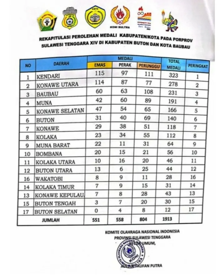 Berikut daftar juara dan perolehan medali Poprov Sultra XIV 2022 :