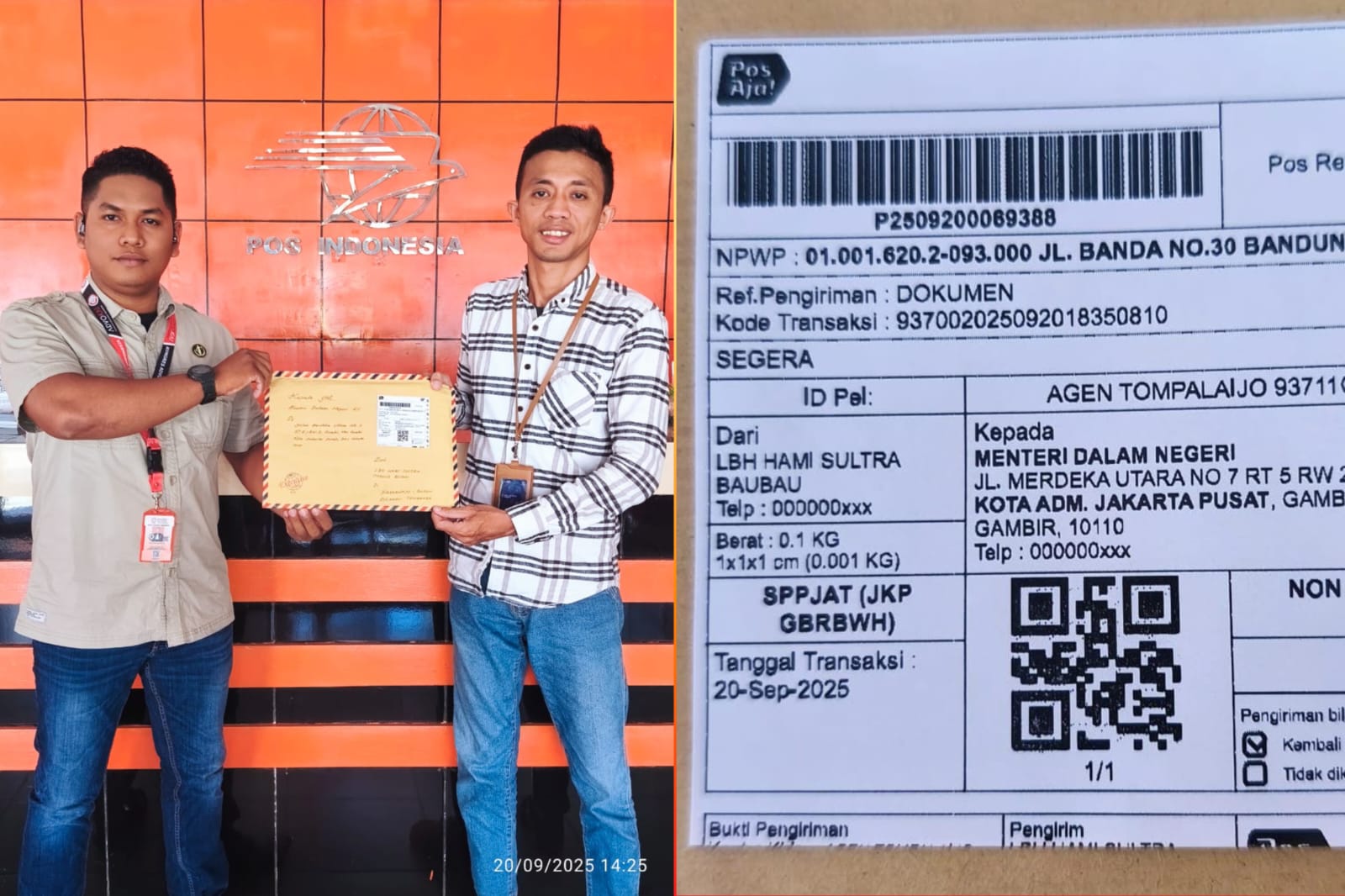 BAUBAU, (MonitorSultra) —Menindaklanjuti surat somasi terhadap Bupati Buton Alvin Akawijaya Putra pada 19 September 2025 kemarin, LBH HAMI melayangkan tembusannya kepada Kementerian dalam negeri (Kemendagri) melalui Kantor Pos Cabang Baubau, Minggu (20/9/2025).