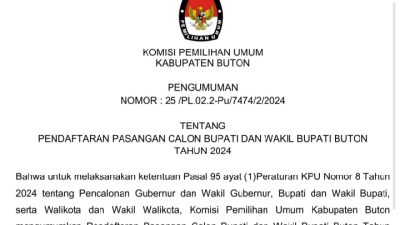 MONITORSULTRA.com, BUTON –Komisi Pemilihan Umum (KPU) Kabupaten Buton secara resmi mengumumkan pendaftaran Bakal pasangan calon…